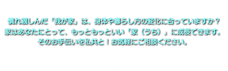 「慣れ親しんだ【我が家】は、身体や暮らし方の変化に合っていますか?家はあなたにとって、もっともっといい【家(うち)】に成長できます。」というポリシーに基づいてお客様のご意見、お気持ちを第一に考え、お手伝いさせて頂きたいと考えております。是非ともお気軽にご相談下さい。